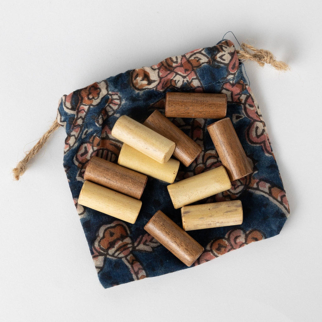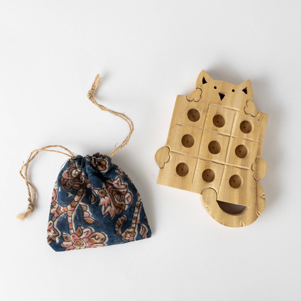 Take your tic tac toe game on the road with Kitty Tic Tac Toe To Go! This playful game features a cute cat holding the game board, where you can use the included wooden pegs to play. The bag, made of assorted blockprint fabric scraps and jute string, can be tied onto the cat's tail to easily transport the small game pieces. Handcrafted by artisan in India with Asha Handicrafts Association, a fair trade organization providing employment to over 6,500 artisans. * Available only in the US - Materials: Wood, block-print cotton - Measures: 5.5"L x 4.5"W - Colors: Natural, assorted - WARNING: CHOKING HAZARD - SMALL PARTS. Not recommended for children under 5. - Barcode: 732919546392 - Handcrafted in India