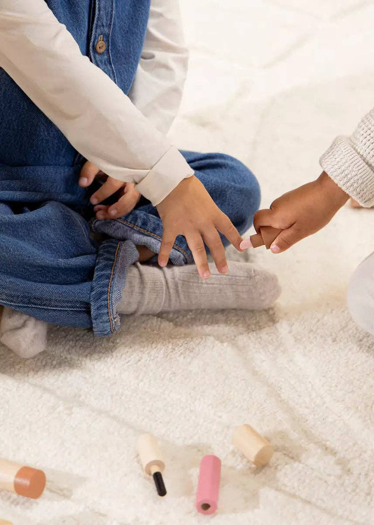 Make-up fascinates children! How fun it is to paint your own face! The Wooden Beauty Set from Coco Village has everything you need to let little ones explore, play and discover makeup, without putting any real products on their skin. Set includes: * 1 lipstick * 1 mascara * 1 eye shadow * 1 varnish * 1 small mirror You will love to see them imitate your own gestures and invent an imaginary beauty routine!