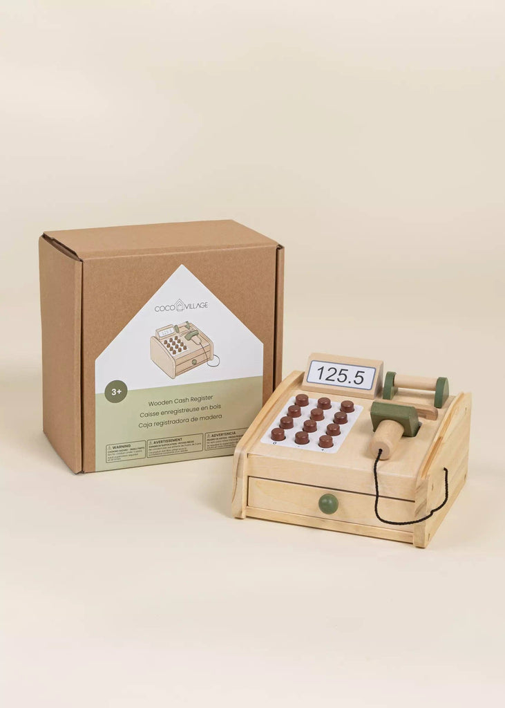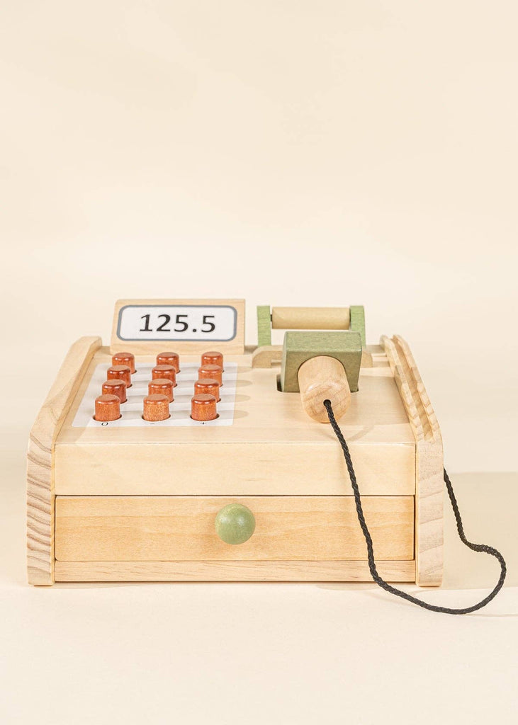 Toddlers love to have fun shopping! From selecting food items to put in the cart to checking out, there is so much to do, discover and learn! The Wooden Cash Register is a perfect item to add to the playroom! It's a fun way to introduce your child to simple math, teaching them to count through play! This set is the perfect addition to the Mini Wooden Play Market Stand and complements the entire collection of wooden market accessories.* *Sold separately. DIMENSIONS * Width : 7.75" (19.6cm) * Depth : 8" (20.3cm) * Height : 5" (12.7cm) FEATURES * Great for kids starting at 3 years old * Cash register made of wood, plywood & MDF * Exclusive design * Comes with coins, bills, and a credit card. Drawer is compartmented and opens to store the cash * Made for indoor use * ASTM F963-17 / SOR / CE certified. This product meets all current standards for chemical components and safety in objects intended for child use * 1 box ASSEMBLY & CARE Made for indoor use. Dust with a dry cloth.
