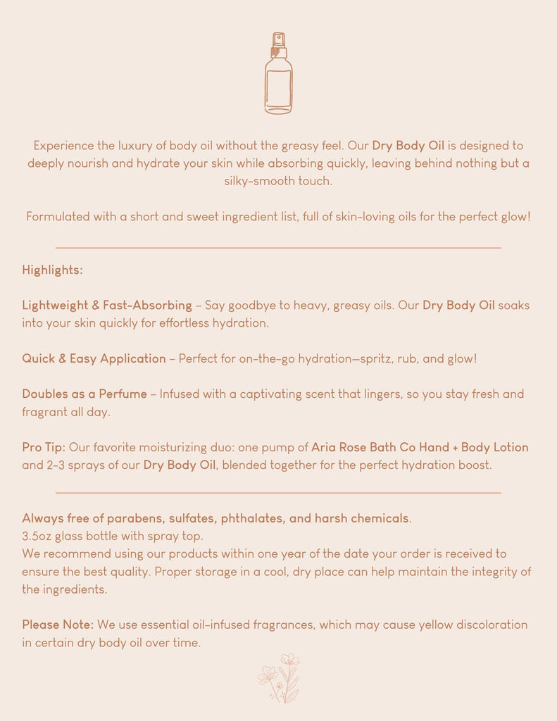 Please Note: We use essential oil-infused fragrances, which may cause yellow discoloration in certain dry body oil over time.