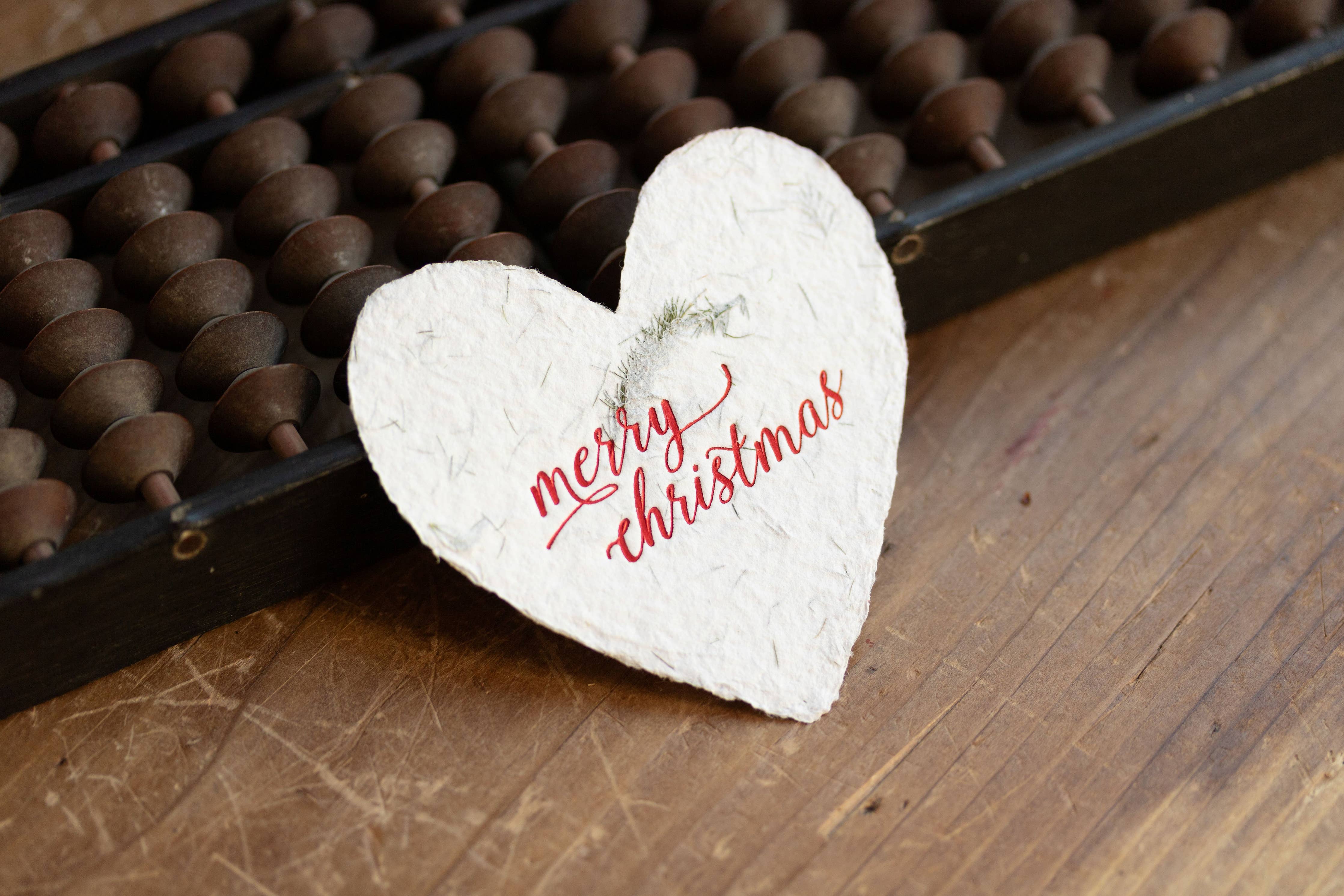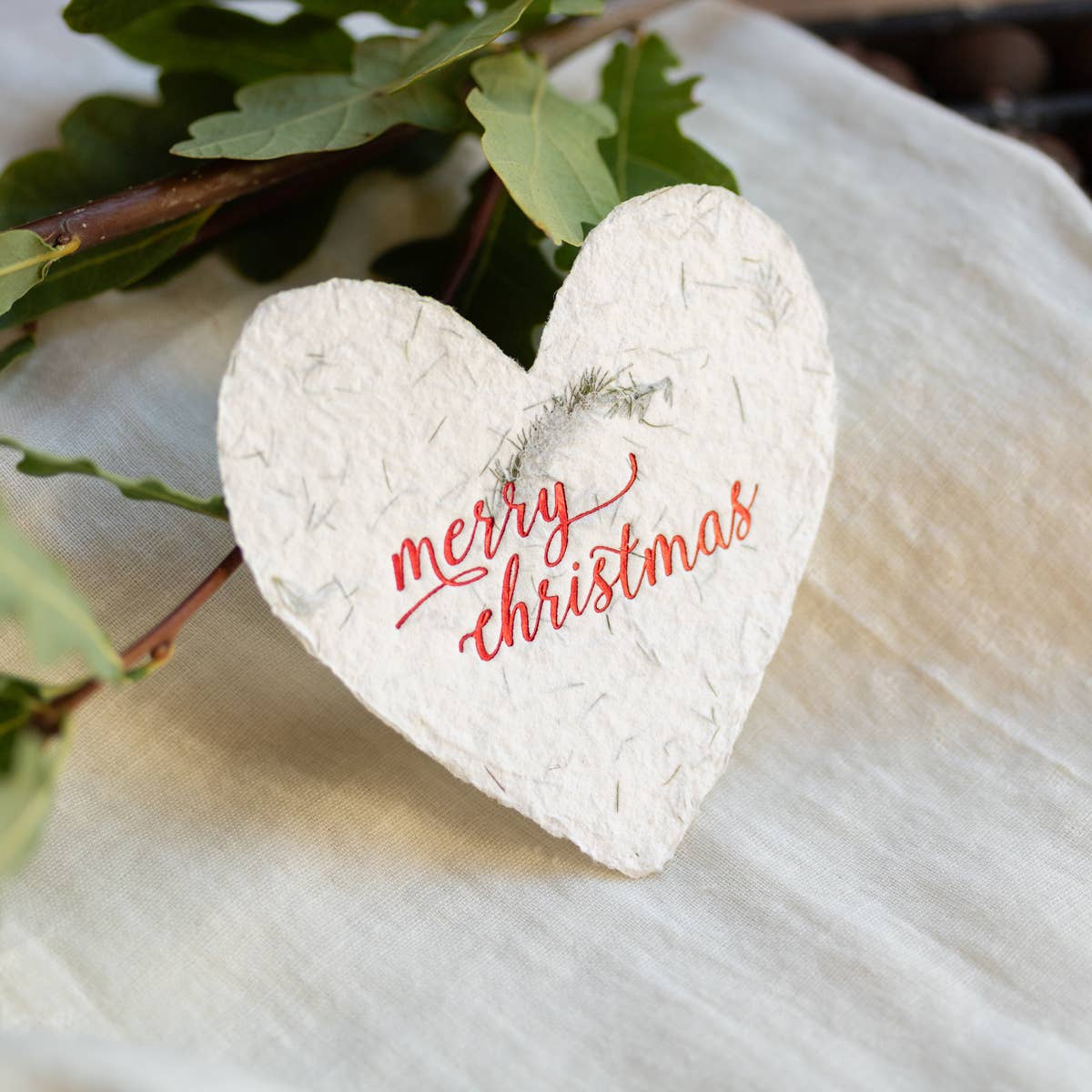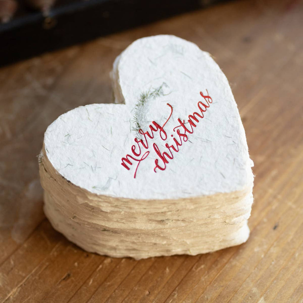 we were thrilled to discover that we could letterpress print on these petite handmade paper hearts using our big, old letterpress machines. aren’t they darling? tuck them into a lunch bag, include them with a wrapped gift, or slip them into a holiday card. single foiled hearts are perfect for restocking your petite bundle display! merry christmas - red foil letterpress on full-deckle fern handmade recycled cotton paper - 3 x 3 inch flat petite foiled heart