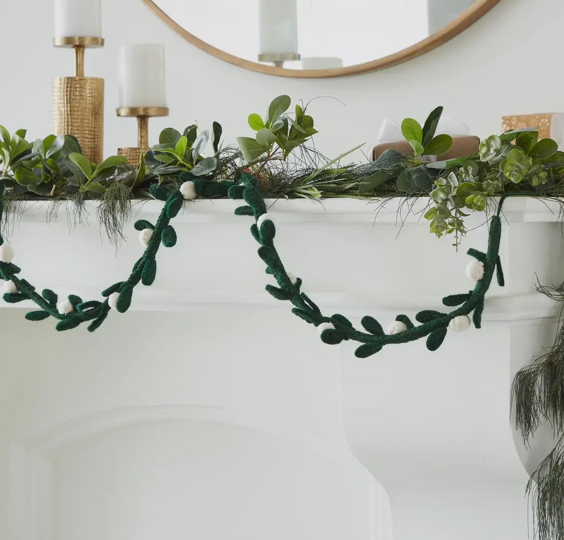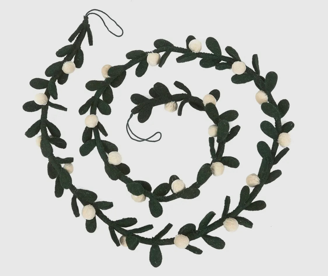 Luxurious cream velvet balls intermingle with traditional mistletoe leaves in hand felted wool on this unique, elegant garland…