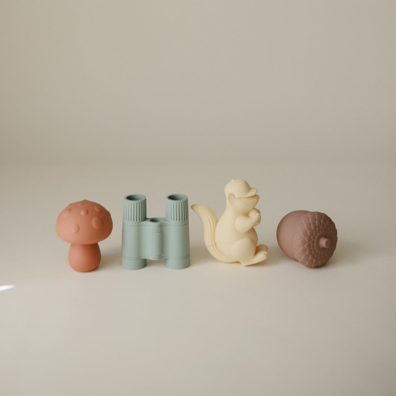 Make a splash at bathtime with the nature bath play set that includes an acorn, mushroom, squirrel, and binoculars. Made from 100% food grade silicone, the soft material is easy for little hands to hold while wet or dry. Its inventive design allows each toy to open into two separate pieces for thorough cleaning and fast drying. This feature allows the toys to remain mold-free with its easy-to-clean pieces that are dishwasher safe.