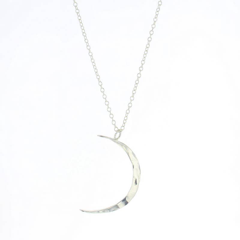 This stunning celestial necklace is shaped and hammered by hand, using traditional forging techniques, making each pendant slightly different and unique! • small: 1-1/4"" pendant •large: 2"" pendant • available in sterling silver & 14k gold-filled • this pendant is best when worn lower on the neck. For this reason we only offer 18"" and 20"" chain lengths for this design. This piece was designed by courtney legenhausen.