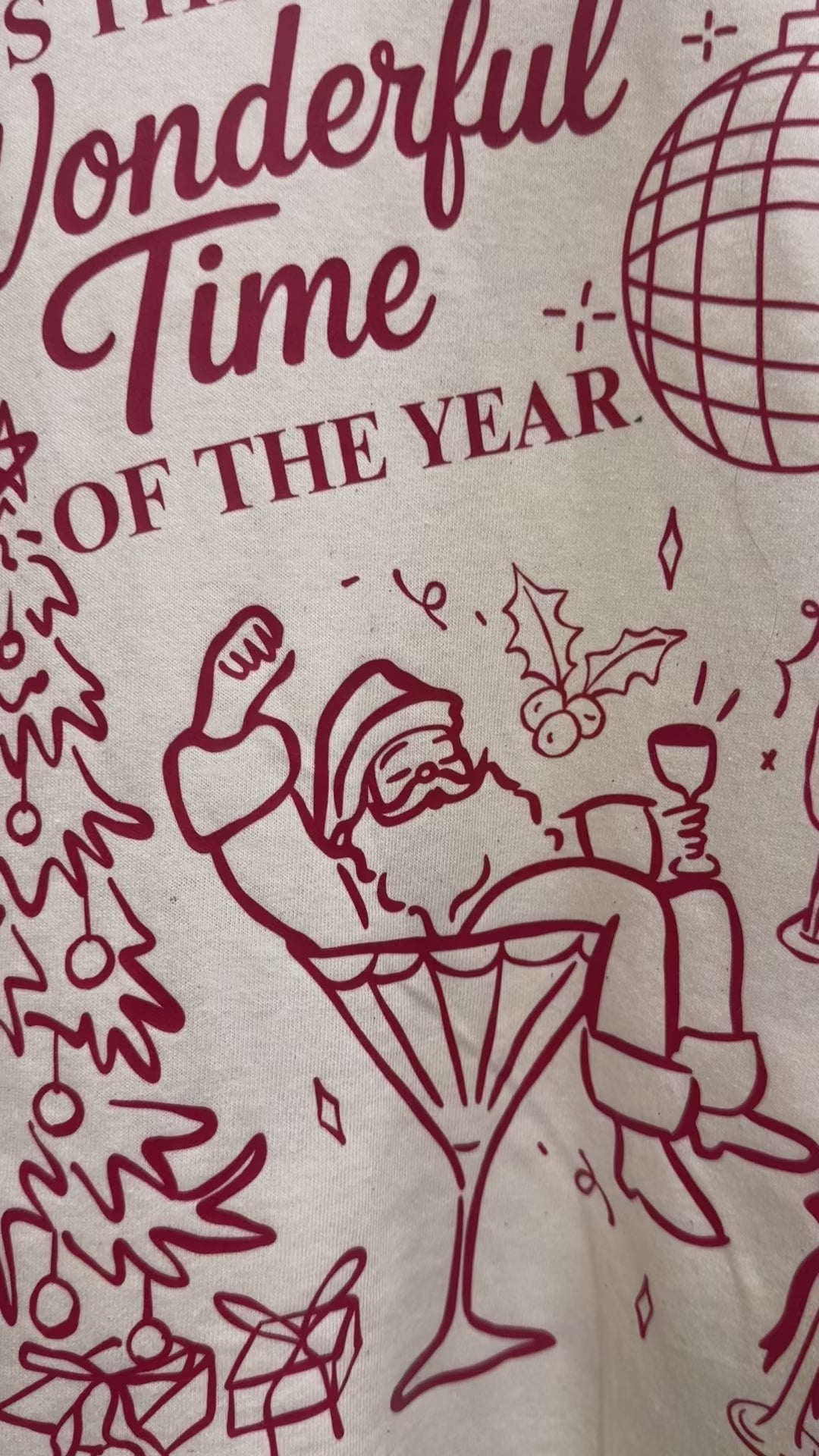 Get ready to celebrate the holiday season in style with our "It's The Most Wonderful Time Tee"! This fun and quirky t-shirt features a festive phrase and an iconic image of Santa in a martini glass. With its neutral tone, this shirt is perfect for anyone looking to add a touch of holiday cheer to their wardrobe. So grab one for yourself or as a gift for a loved one and get ready to spread some holiday joy!