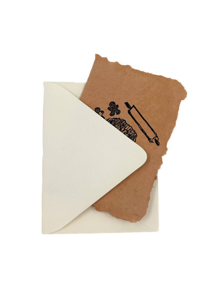 Terra Cotta handmade paper with black letterpress ink. Handmade paper card with four full deckled edges, hand folded with inside blank. Front is letterpress printed; back is letterpress printed with a small note including information about the natural dyes used to color each unique piece of paper. Comes with an acru A2 envelope and a small card matte printed with photos and a little information about our process. Card features an image of a rolling pin and gingerbread cookies and reads "happy holidays"