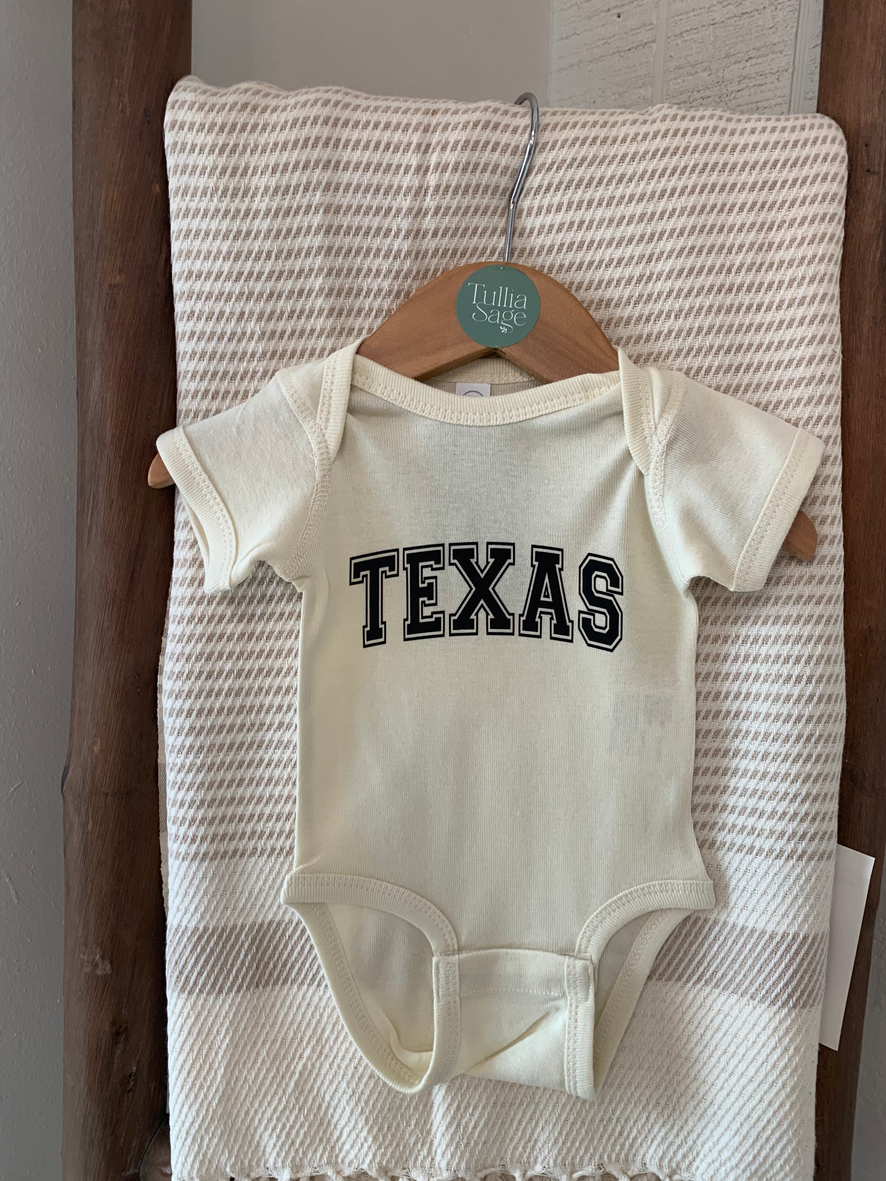 Show off that Lone Star pride with our Texas baby bodysuit! Designed with a classic collegiate block print, this outfit celebrates the spirit of Texas while keeping your little one comfy and stylish. Perfect for game days, family outings, or as a thoughtful Texas-themed gift.