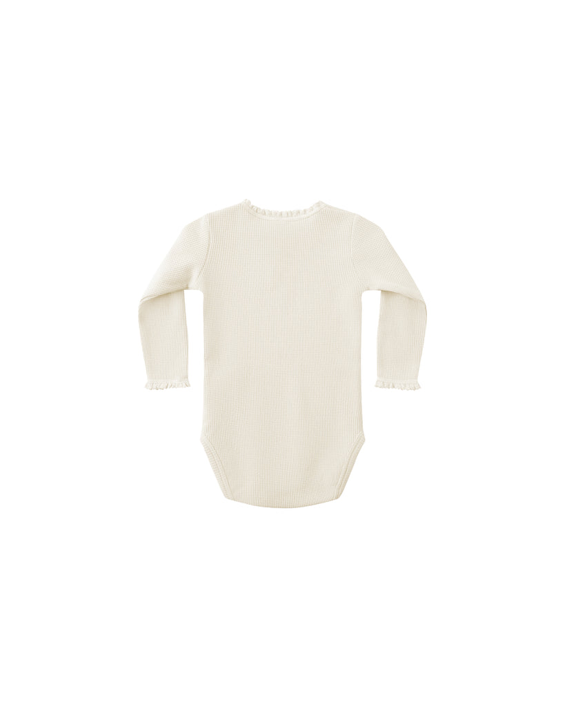 Long sleeve onesie in our lightweight waffle knit, featuring the sweetest crochet lace ruffle detail. Designed with shoulder and bottom snaps for easy changes.