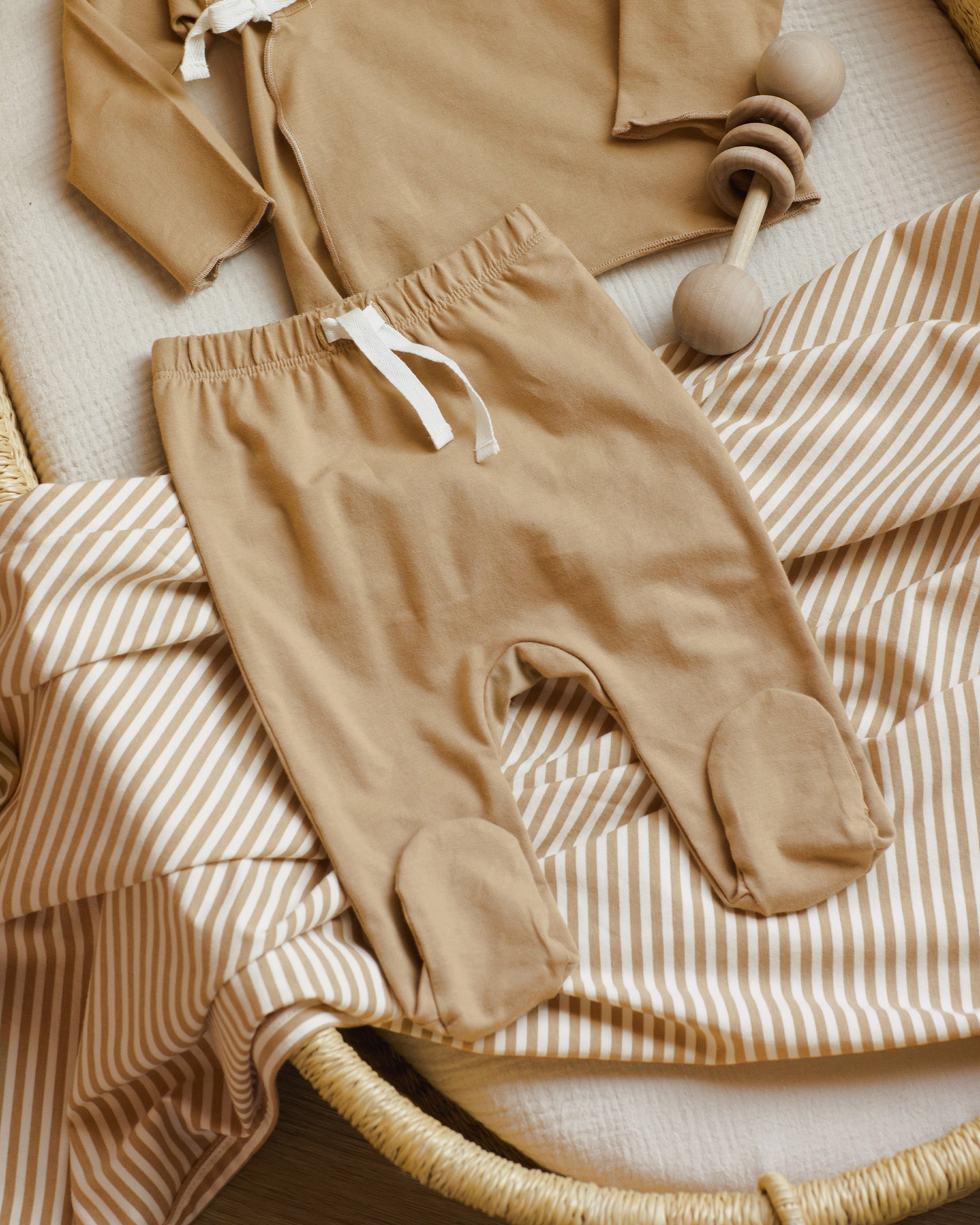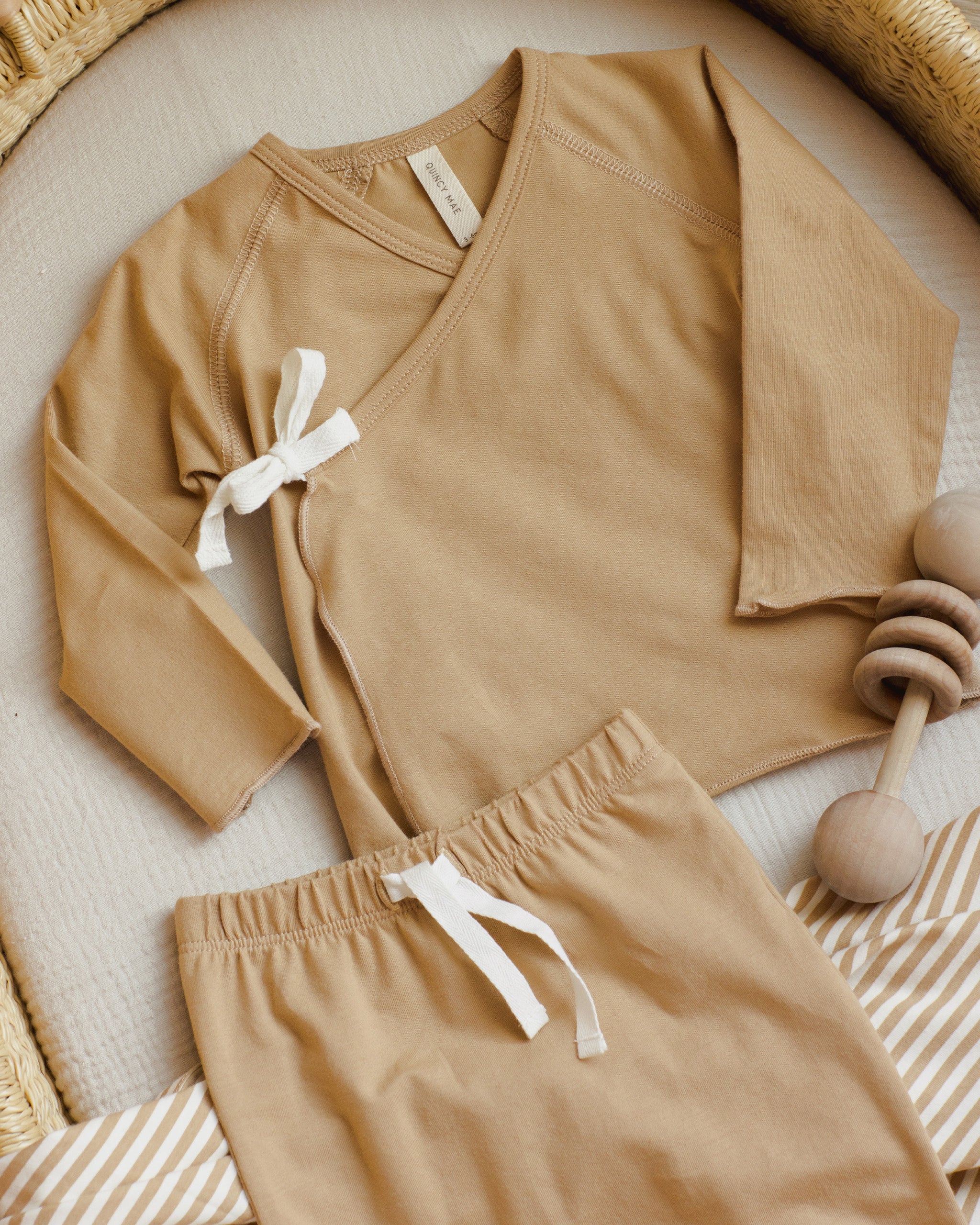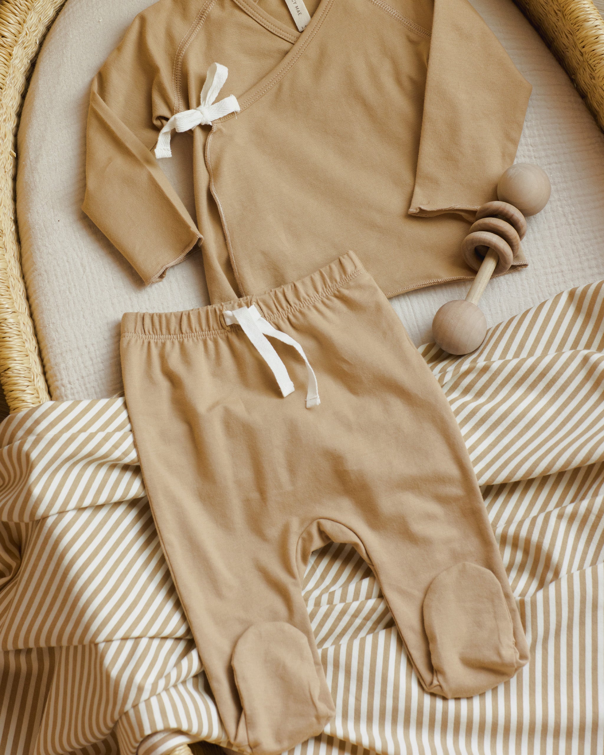 This sweet set features a long sleeve wrap top with a soft side-tie and hidden interior snap for easy dressing, paired with cozy footed pants with a gentle drawstring waist. Made for newborn snuggles and those first precious months at home.