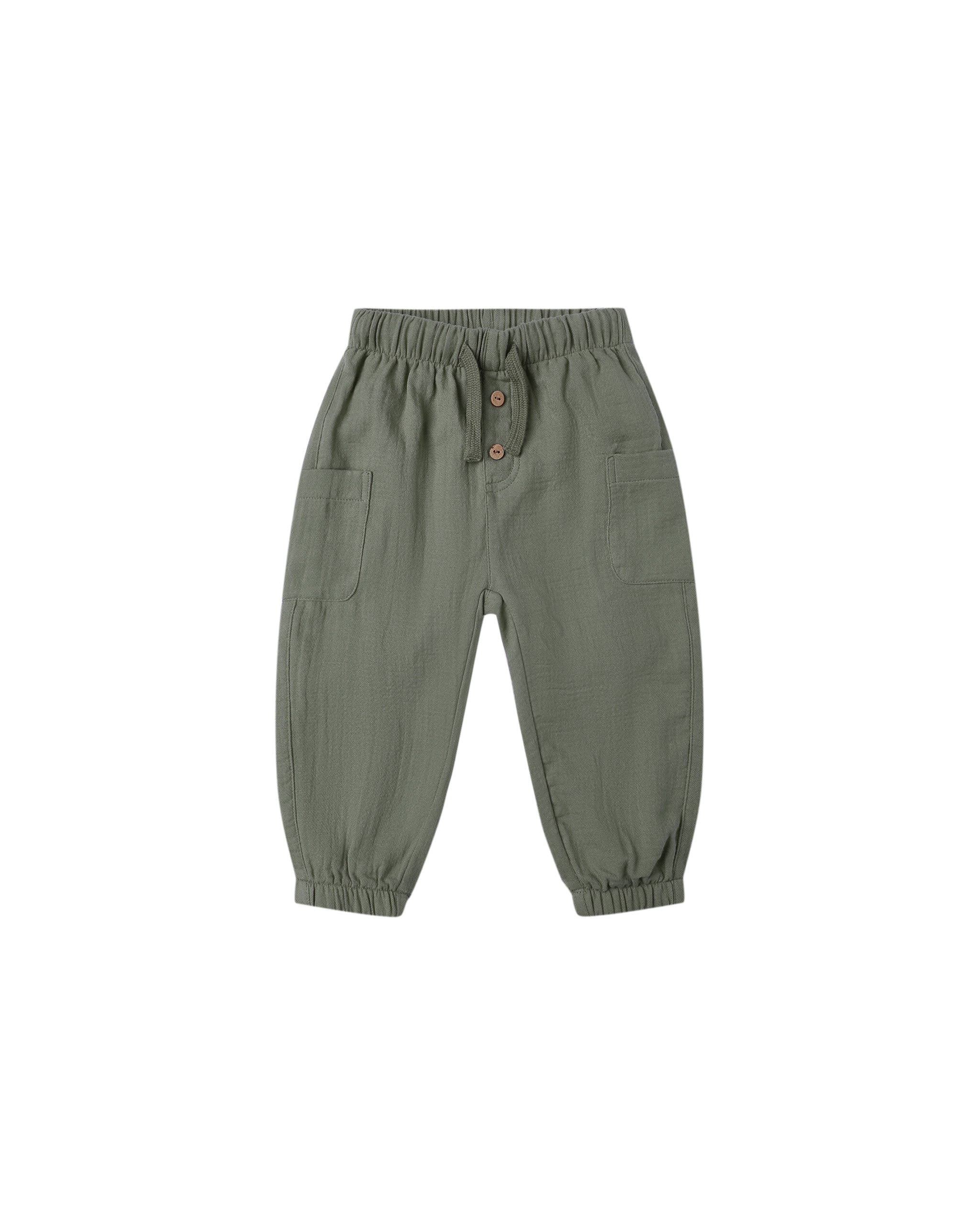 Comfortable corduroy pants with an elastic waistband and leg openings, adjustable drawstring, and side patch pockets. Featuring our ‘forest’ hue. Care: Machine wash. Lay flat to dry. Made of 98% organic cotton / 2% elastane. |