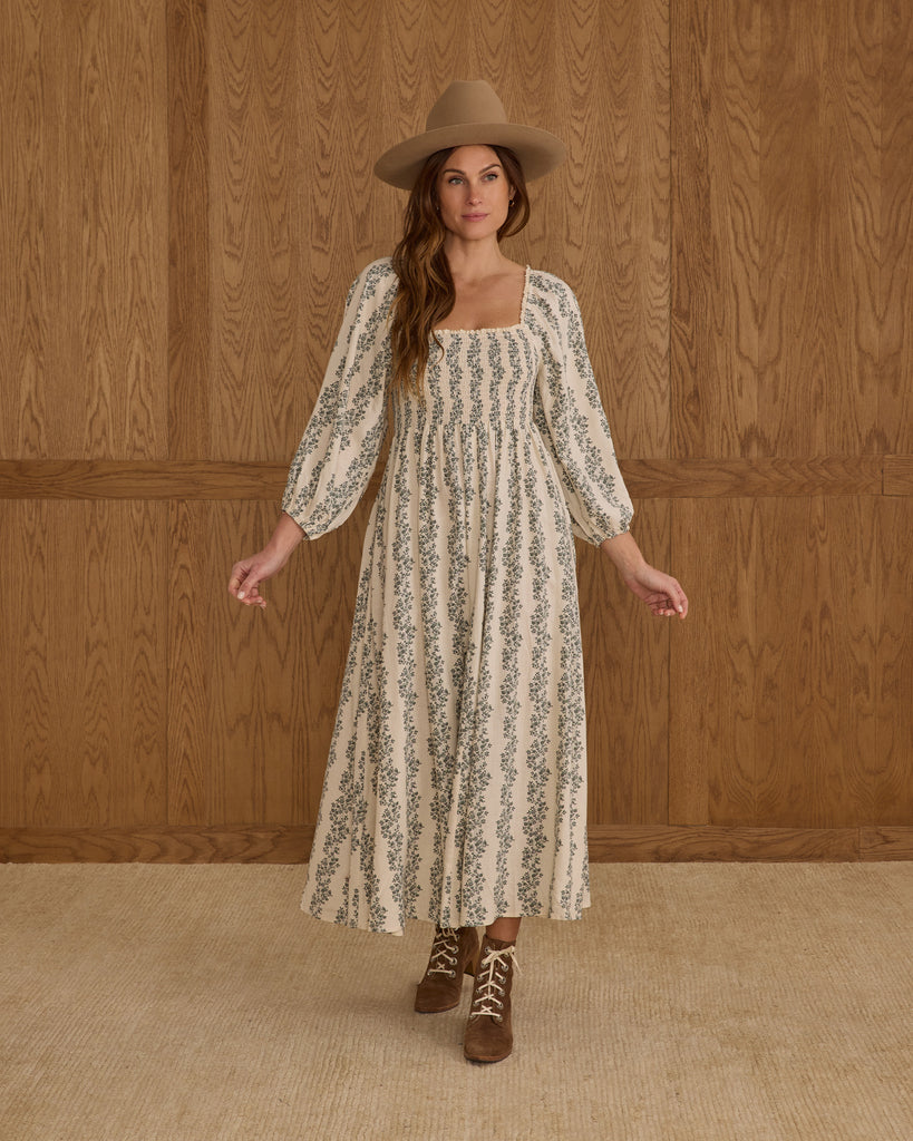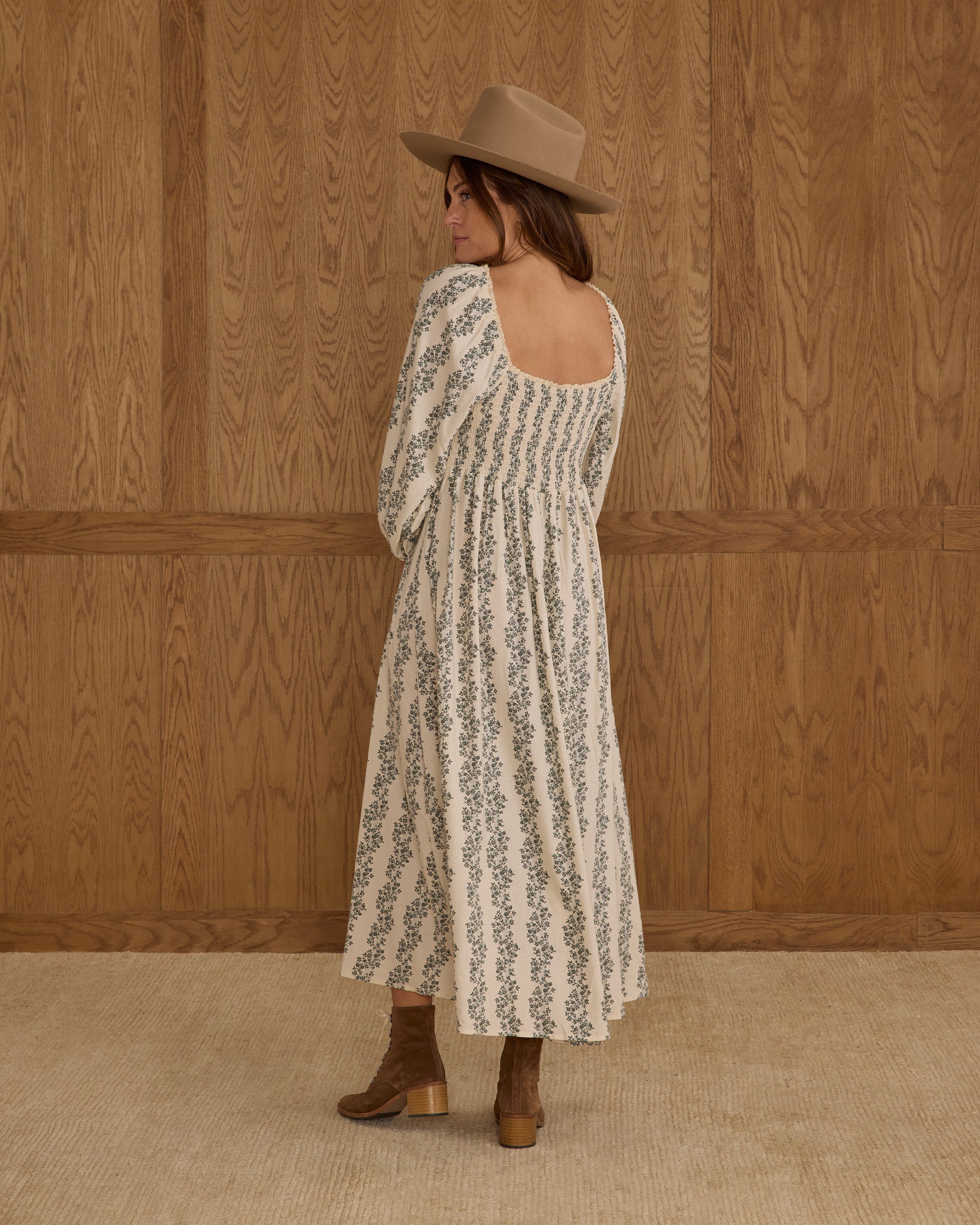 Our Della Dress features a smocked bodice and mid-length sleeves, beautifully accented with intricate crochet trim along the neckline.