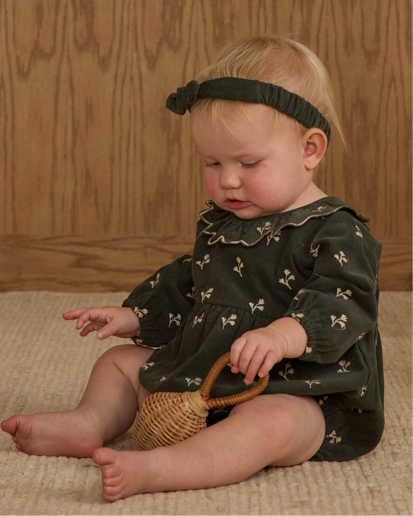 Baby headband set with a scrunchy elastic band for added comfort, topped off with a sweet finished bow. One size. Featuring our 'evergreen' colorway. Made of 100% cotton |
