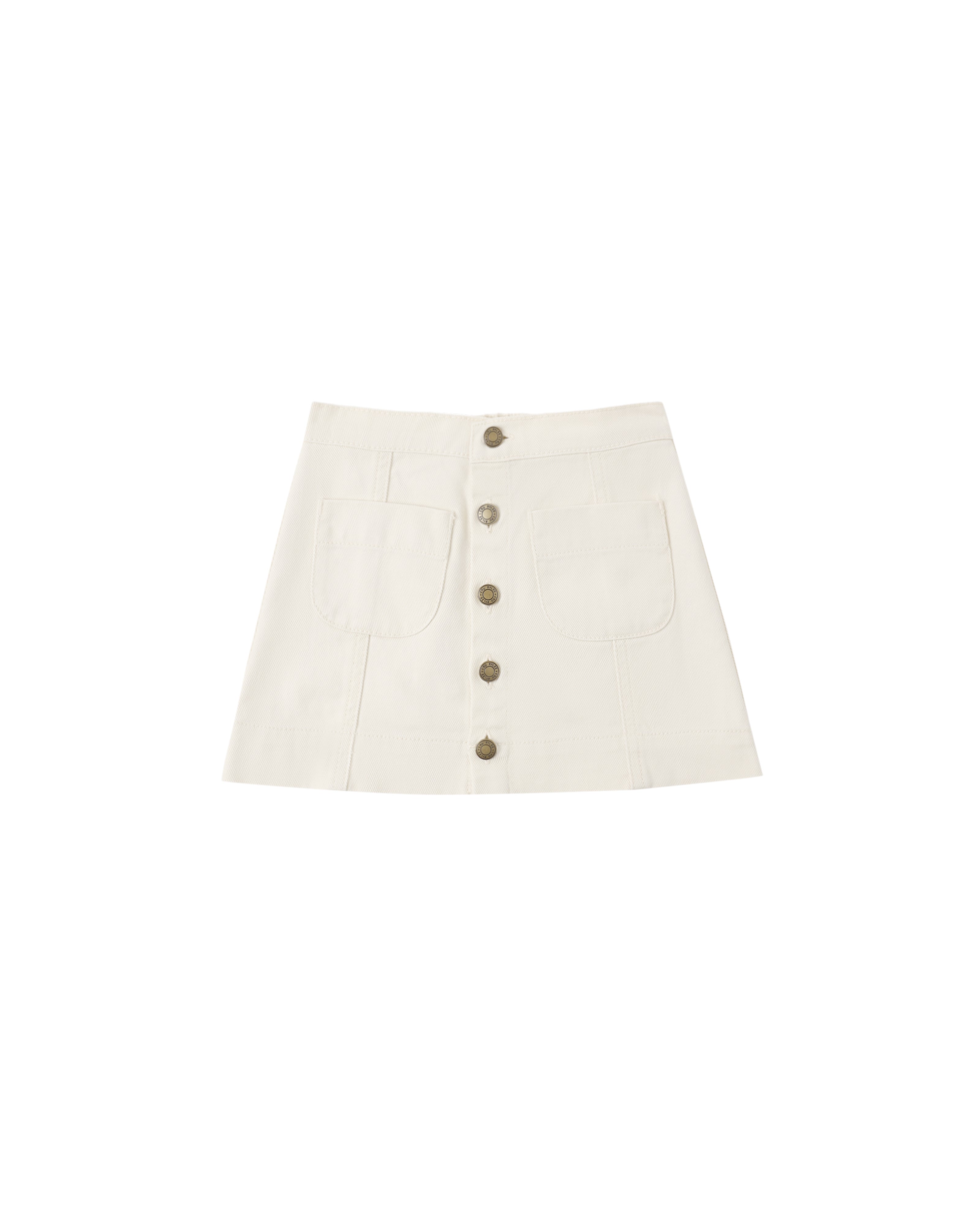 This versatile denim skirt channels preppy charm with antique brass buttons and front patch pockets accented by contrast embroidered stitching.