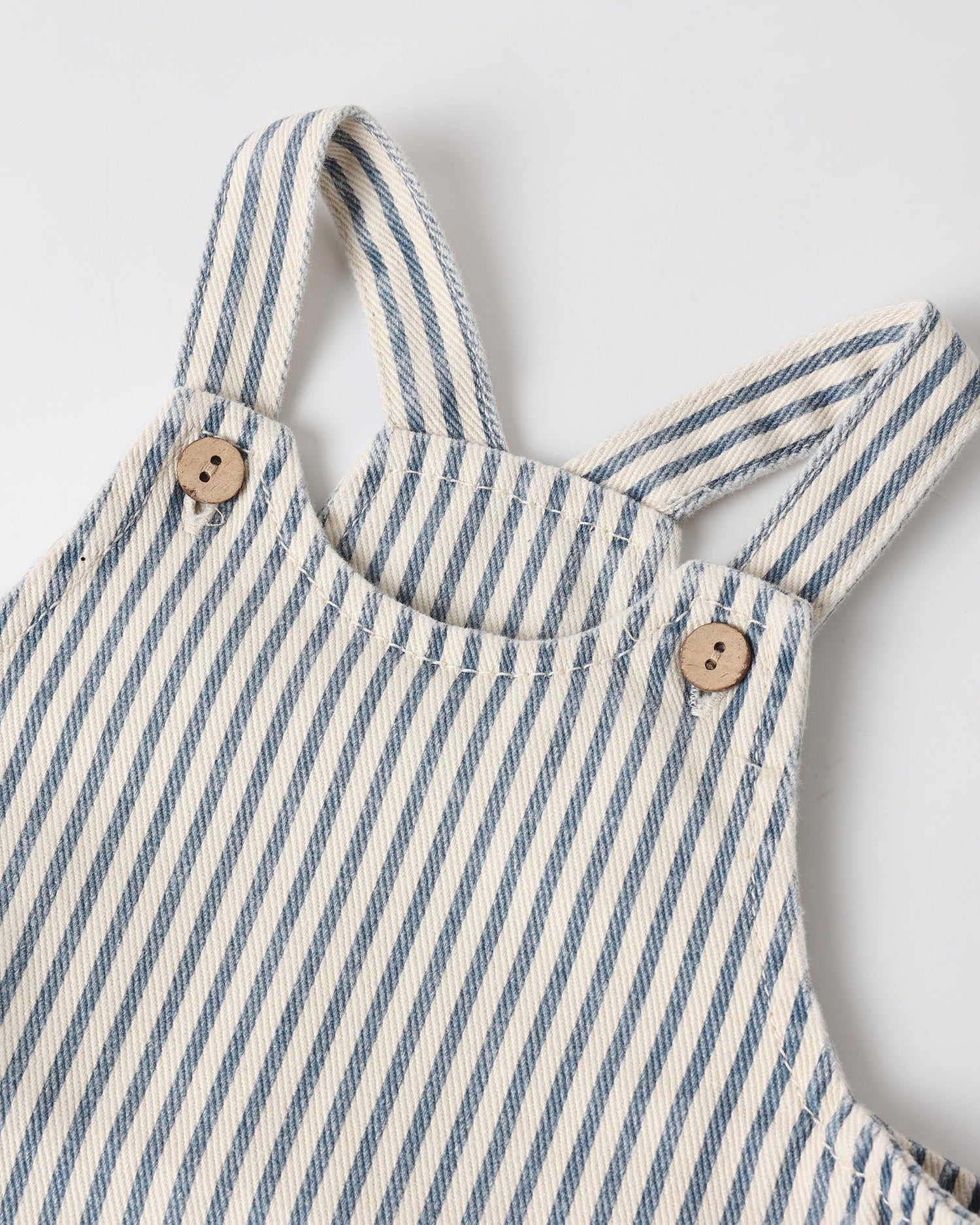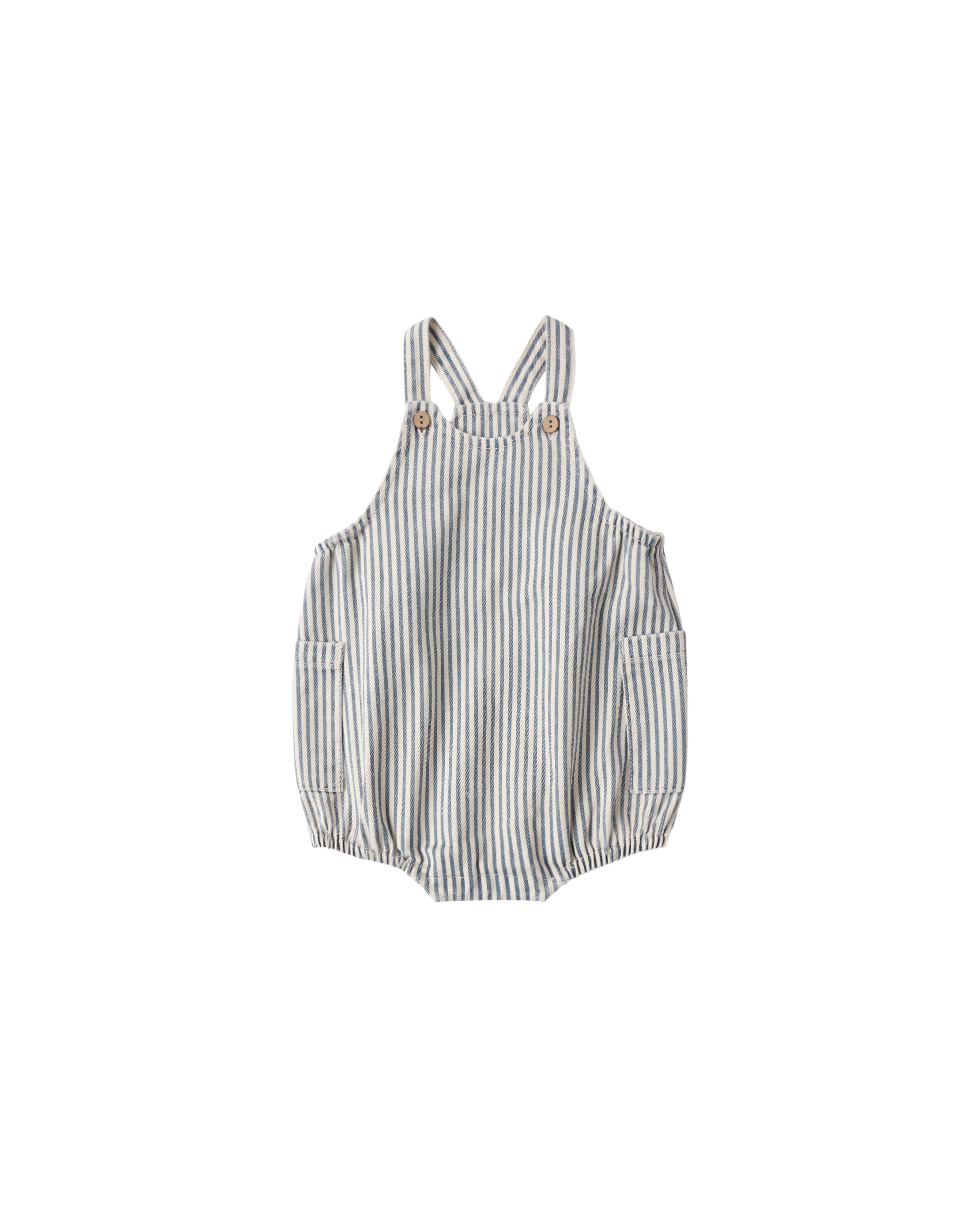 Our charming Lou Romper features shoulder straps with coconut button attachments, pockets, and bottom snaps for easy changes.