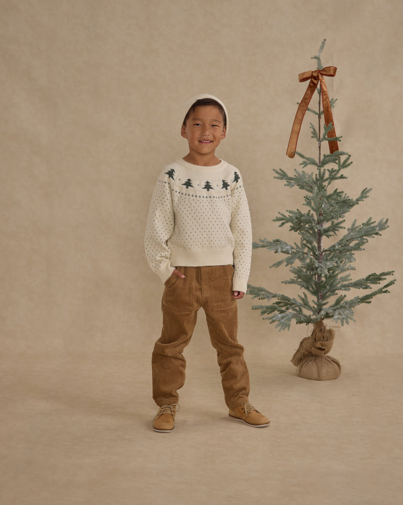 This Fair Isle Sweater is a cozy knit with a classic tree motif and timeless fair isle patterning. Designed in a natural base with green details, it’s the perfect blend of comfort and charm for chilly days.