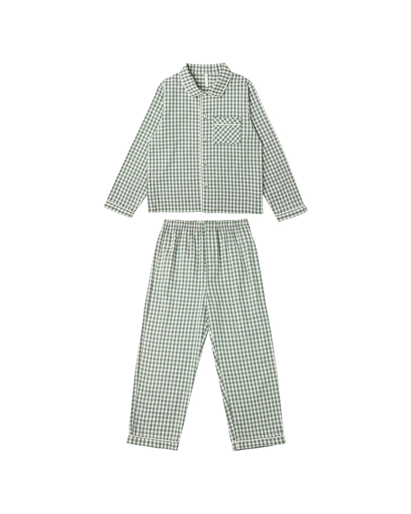 Our Boys pajama set includes a soft long sleeve top and cozy pants. The top has a pocket at the front, and the pants have an elasticized waistband.