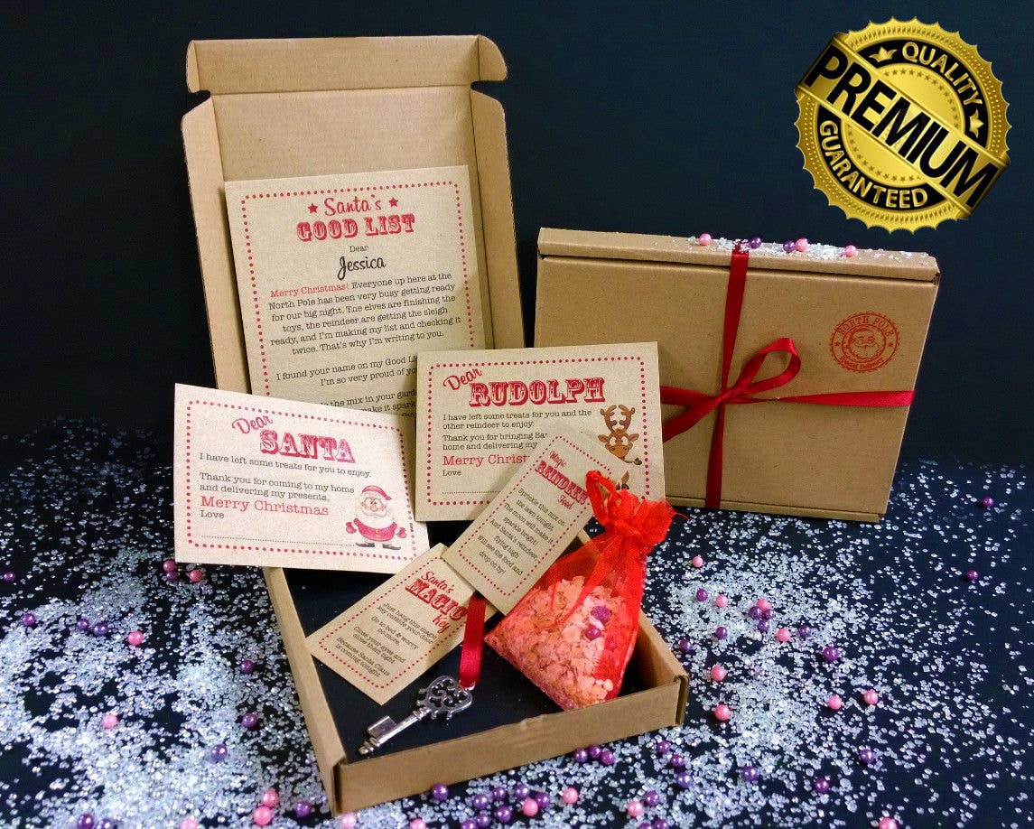 Includes: Letter/Certificate from Santa Magic Key & Tag Magic Reindeer Food (with edible oats & rainbow drops) Dear Rudolph Card Dear Santa Card
