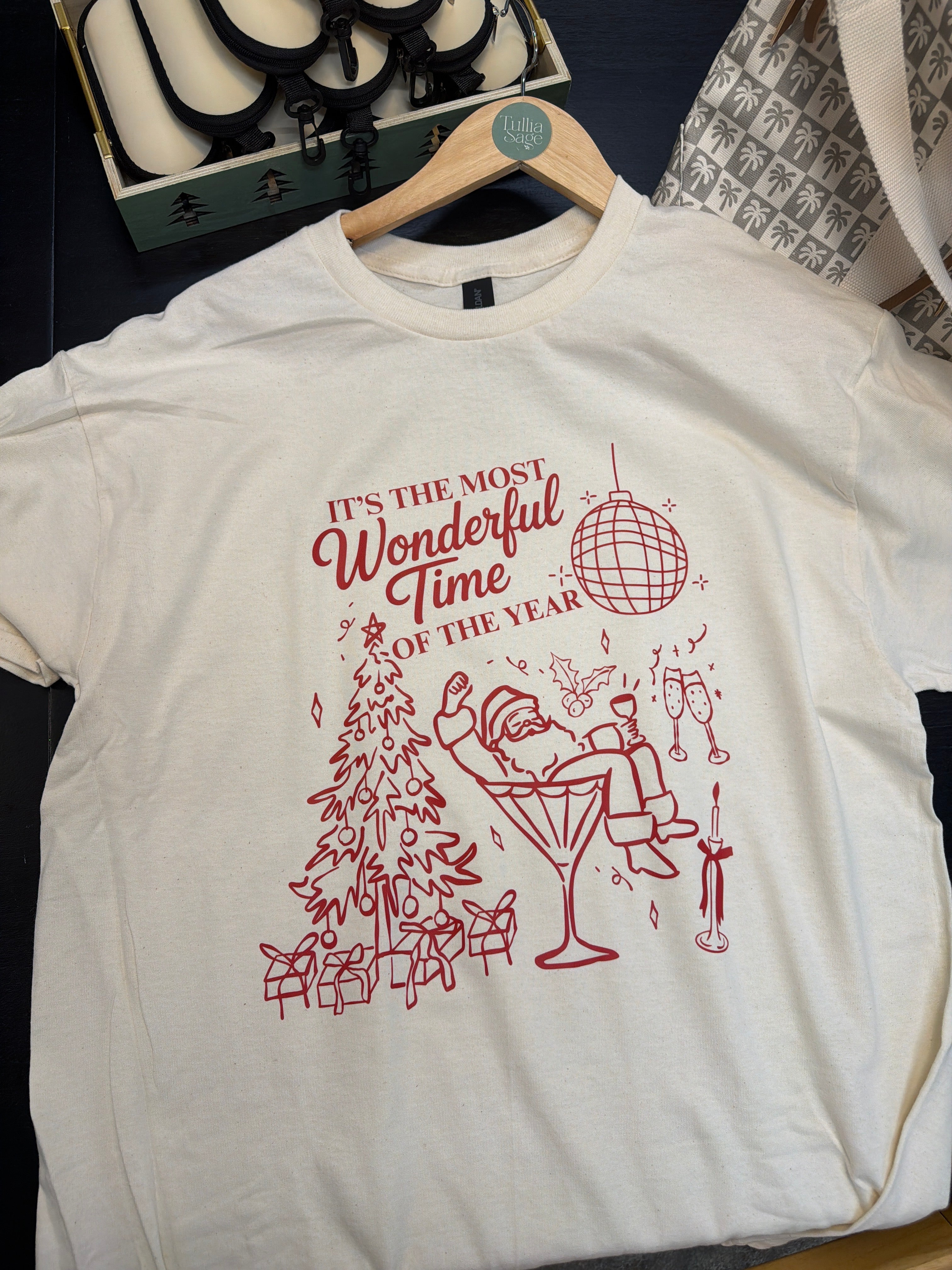 Get ready to celebrate the holiday season in style with our "It's The Most Wonderful Time Tee"! This fun and quirky t-shirt features a festive phrase and an iconic image of Santa in a martini glass. With its neutral tone, this shirt is perfect for anyone looking to add a touch of holiday cheer to their wardrobe. So grab one for yourself or as a gift for a loved one and get ready to spread some holiday joy!