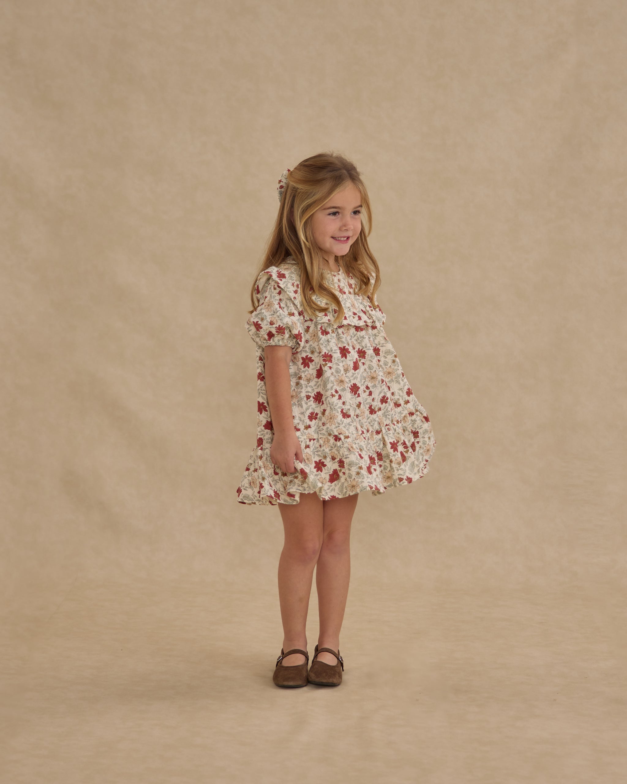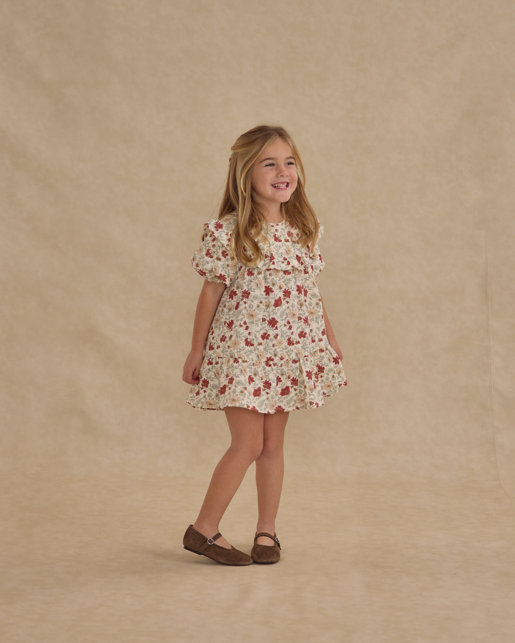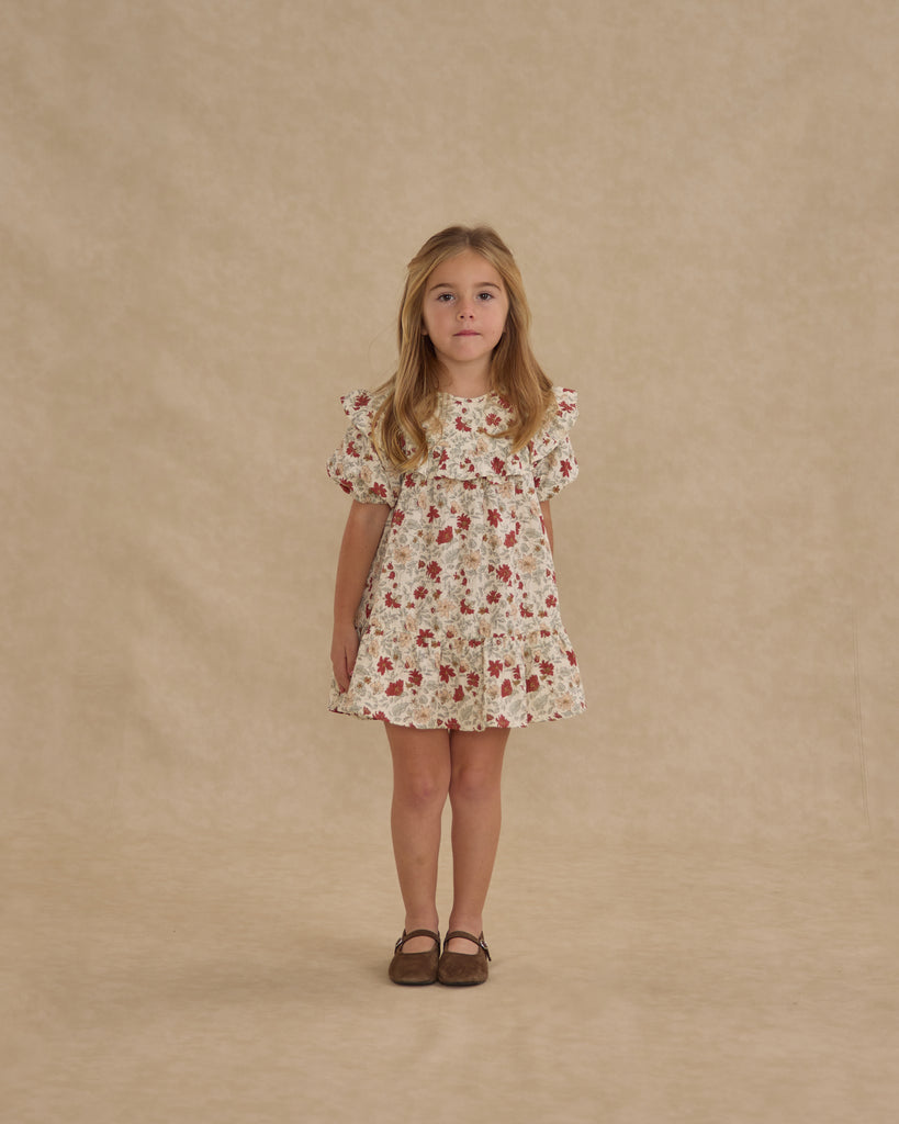 Our Cordelia Dress features elasticized sleeve openings and a ruffle along the neck and bottom skirt.