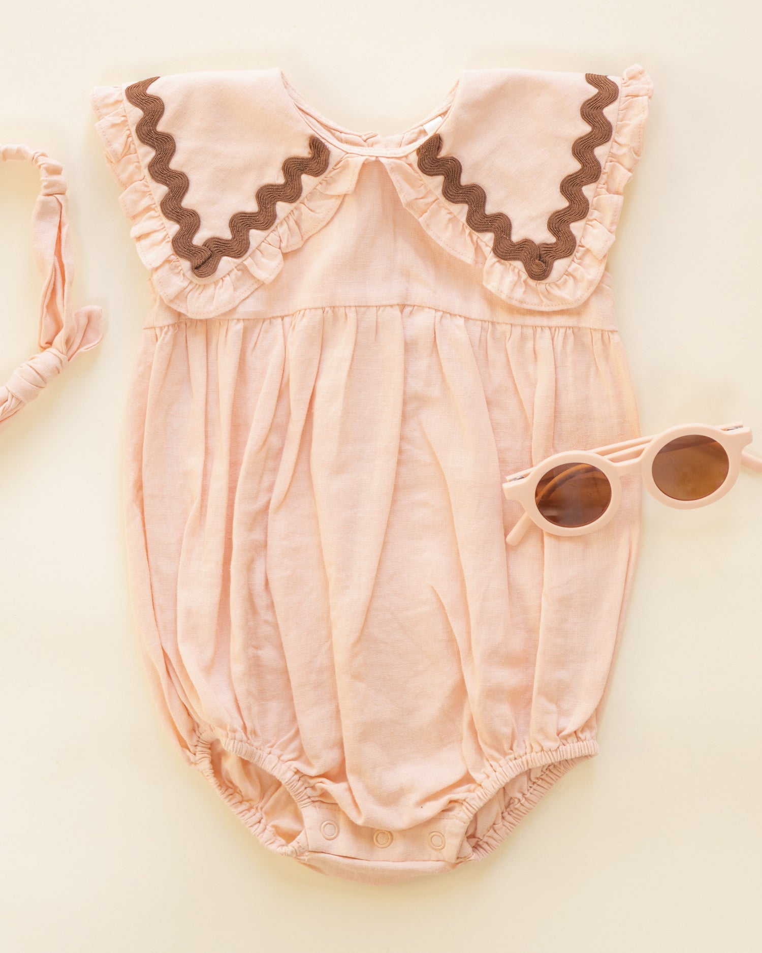 Featuring our 'blush' hue with 'chocolate' ric rac trim.