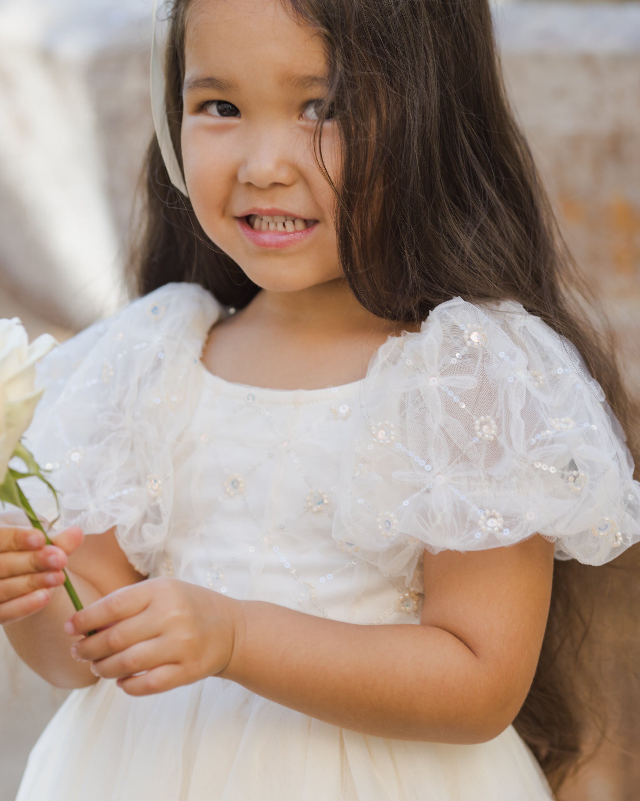 The Dorothy Dress features a delicate embellished mesh bodice with subtle sequins, voluminous puff sleeves in airy tulle, and a softly gathered skirt that creates a dreamy silhouette. With its whimsical sparkle and fairytale charm, it’s a picture-perfect choice for holiday celebrations and special occasions.