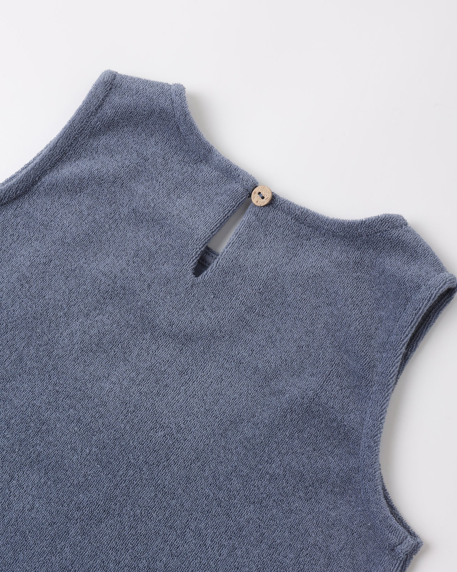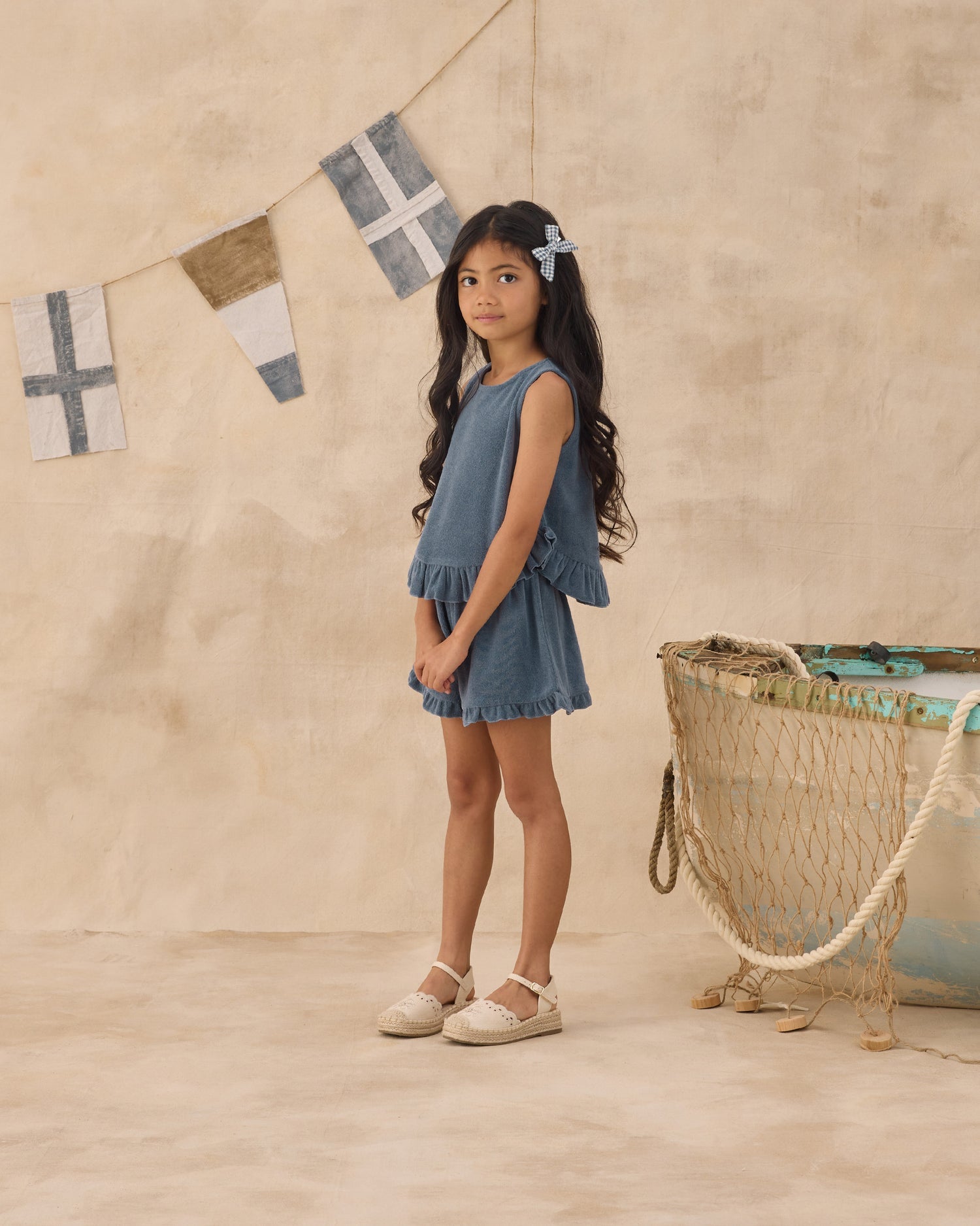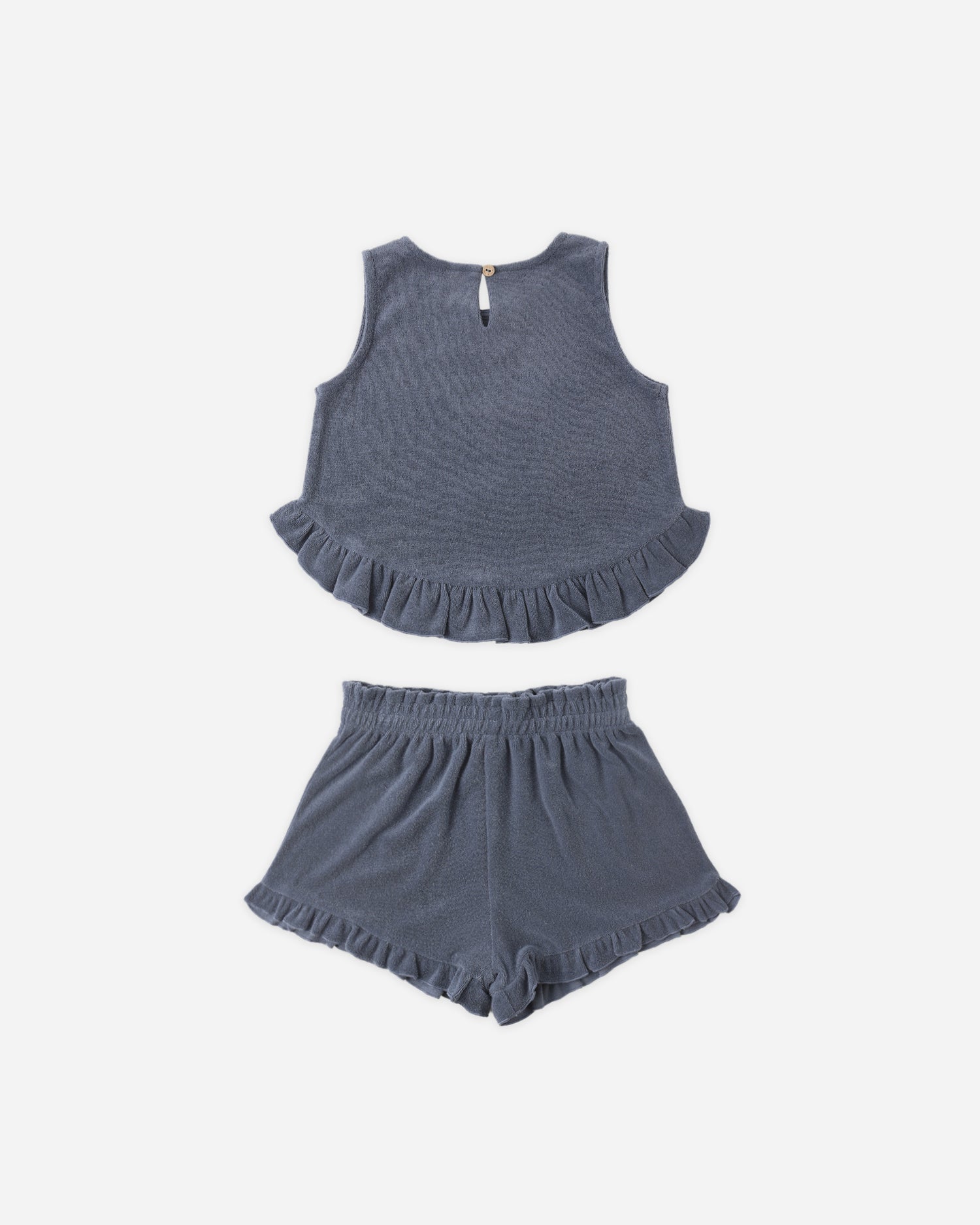 This terry cloth set features a scoop neck tank with bottom ruffle detail and matching shorts with an elastic waistband and a wide leg fit for a relaxed and breezy look.
