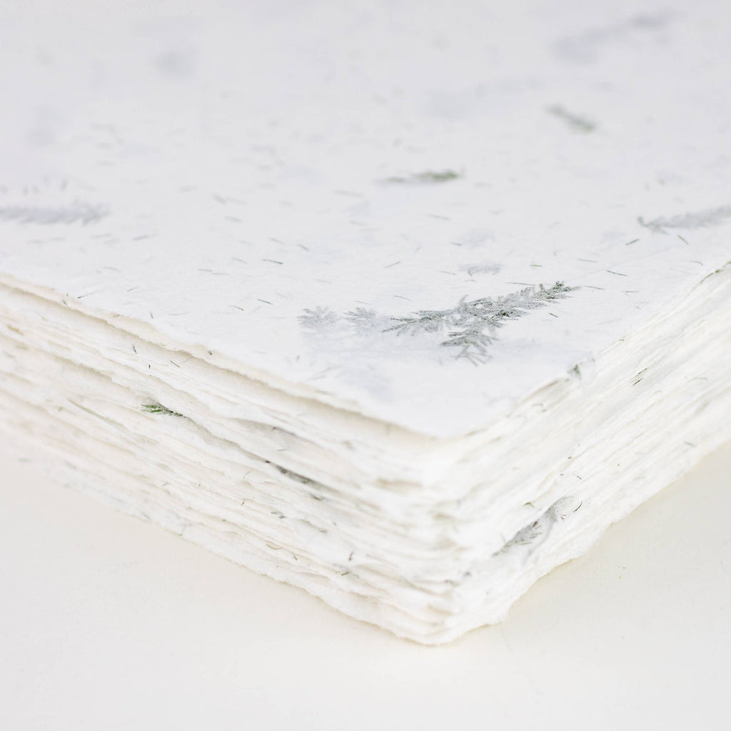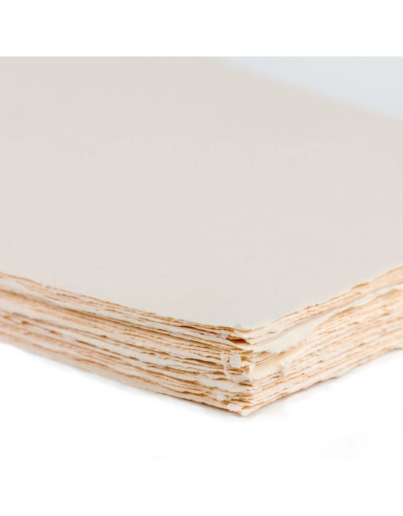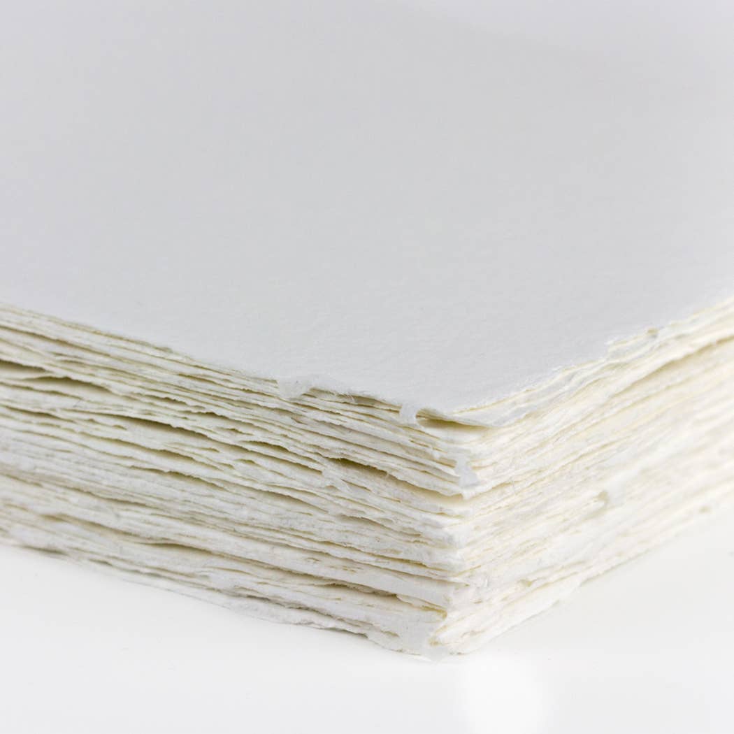 BULK handmade paper orders may have up to a 3-4 week production turnaround time due to the paper making process. to inquire about quantities and turn around times, please send us a message. our handmade paper is available in bulk stacks of 50 blank sheets for use in creative projects or to add a natural element to store displays. these may be offered to customers in quantities or by the sheet. non-deckled edges are available with a cutting fee. - 5 x 7 inch handmade recycled cotton paper with natural decked edges - bulk set of 50 sheets - bulk does not include envelopes or sleeves - this paper is designed for letterpress printing and will not perform well in an ink jet or laser printer