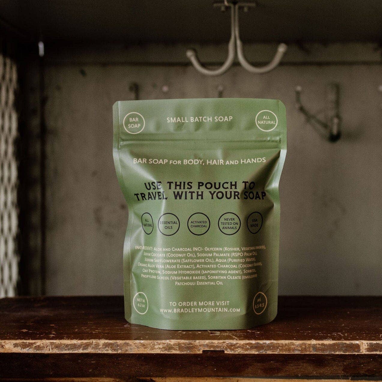 Our Charcoal Bar Soap is made in house with custom shaped molds. We wanted a bar of soap that you could really scrub with so w made it extra thick. This soap is for hair and body and is scented with essential oils. This bar soap is all natural, made in USA, and comes with a resealable travel pouch. Ingredients: Aloe and Charcoal INCI- Glycerin (Kosher, Vegetable based), Sodium Cocoate (Coconut Oil), Sodium Palmate (RSPO Palm Oil), Sodium Safflowerate (Safflower Oil), Aqua (Purified Water), Organic Aloe Vera (Aloe Extract), Activated Charcoal (Coconut Based), Oat Protein, Sodium Hydroxide (saponifying agent), Sorbitol, Propylene Glycol (Vegetable based), Sorbitan Oleate (emulsifier). Patchouli Essential Oil * All Natural Bar Soap * For Body and Hair * 6.2 oz net weight * Small Batch * Resealable Travel Pouch Included * USA Made