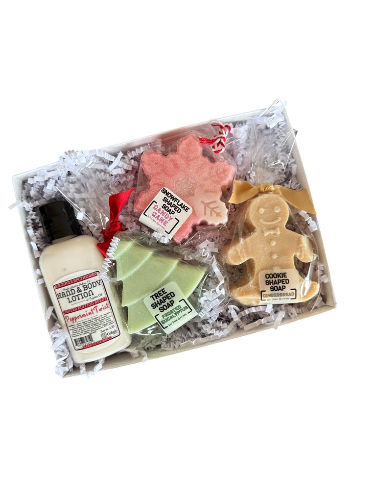 Indulge in the ultimate holiday pampering with our cute Holiday Friends Gift Set. This luxurious set includes 3 premium Shea Butter soaps in fun holiday shapes and a moisturizing lotion in a festive holiday scent, all beautifully packaged in a white gift box with a bow. Treat yourself or a loved one to the perfect gift of relaxation and nourishment.